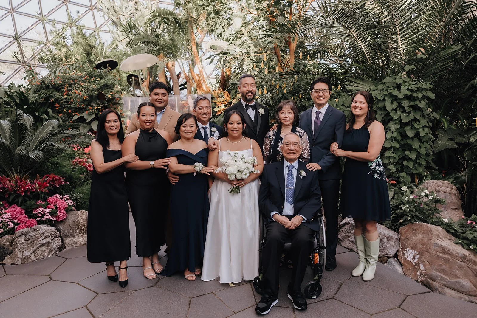 When T and J reached out to me for their elopement, they envisioned something private, natural, and accessible for their families. They wanted their wedding day to be a celebration centred on connection rather than production. As soon as I got to know them, I knew their day had to reflect their love of nature, thoughtful personalities, and deep care for their families. The answer? A September microwedding at the Bloedel Conservatory in Vancouver’s Queen Elizabeth Park.